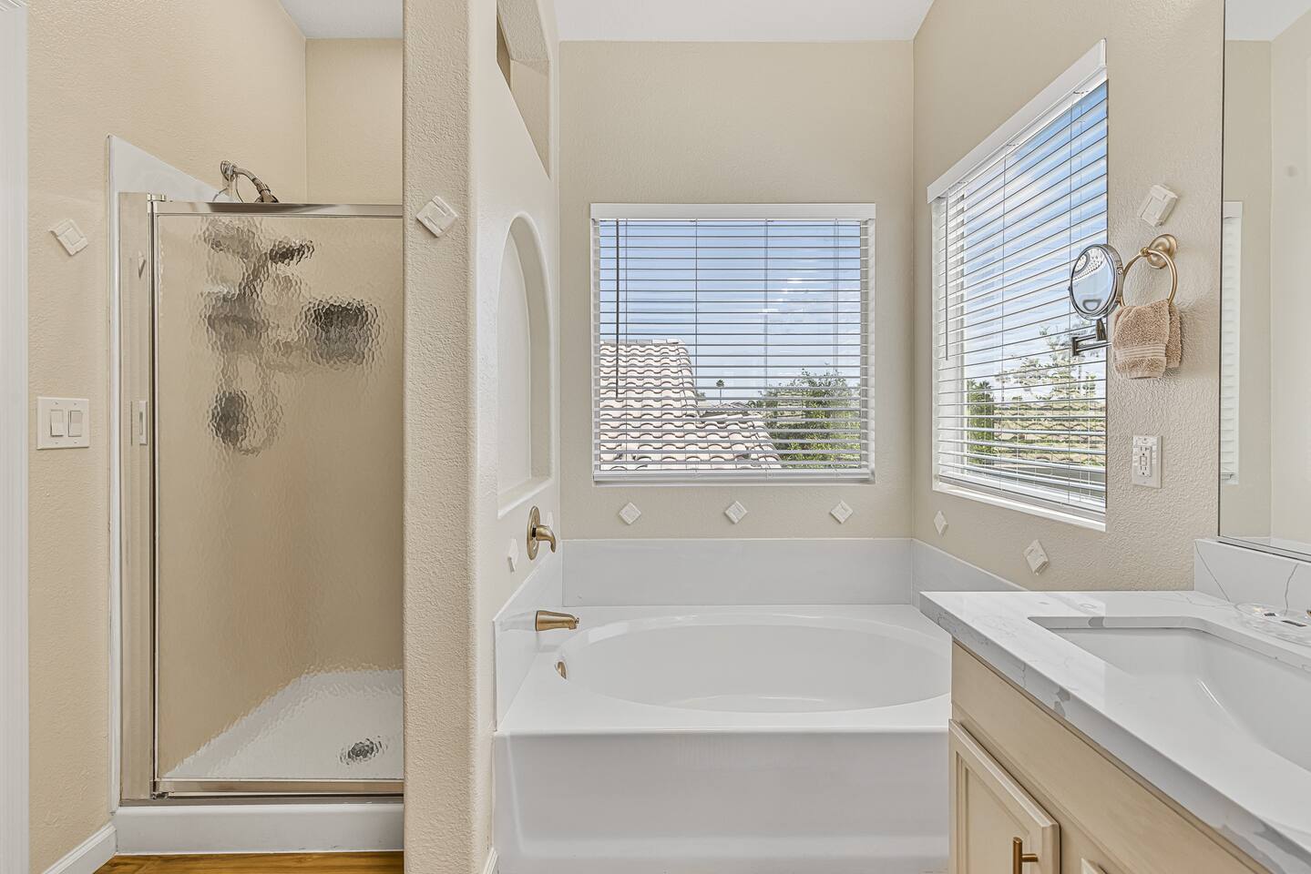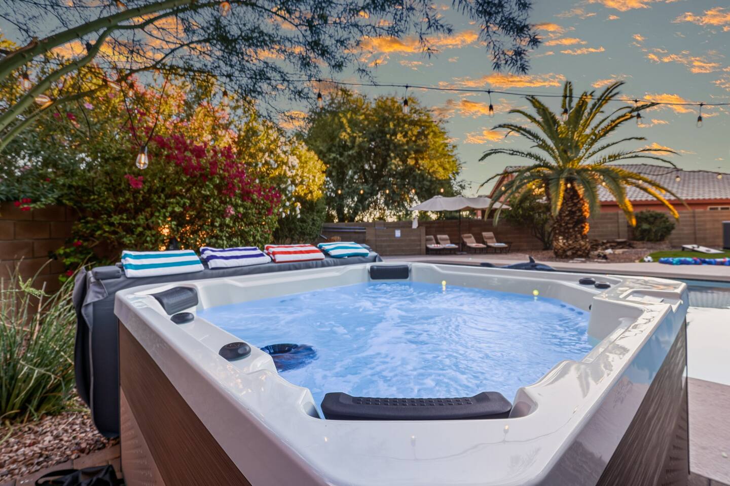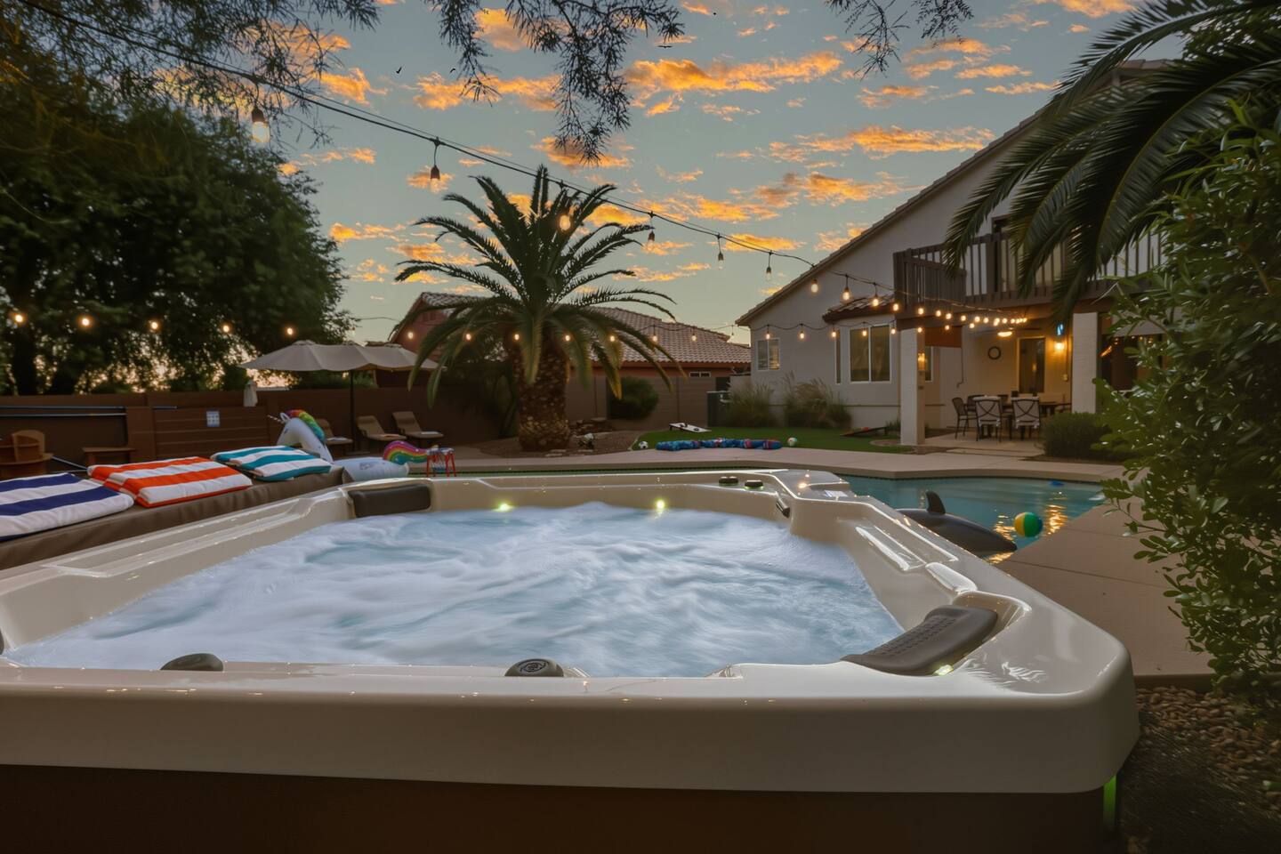 Lounge by the pool or spacious hot tub, unwind by the fire pit, play games, and explore nearby shops, restaurants, and nature.